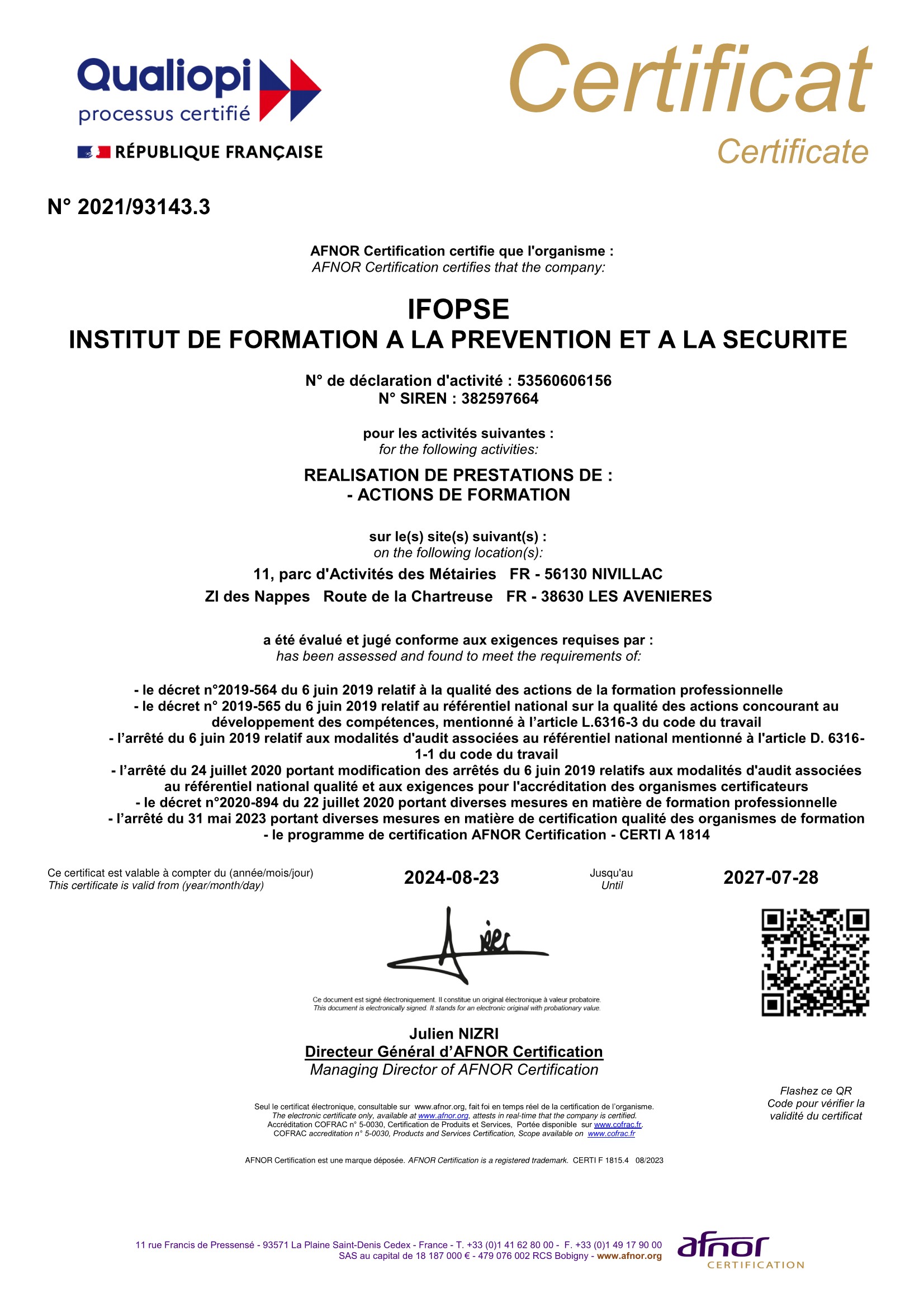 - IFOPSE est certifié ISO 9001, ISO 9001 Organismes de Formation , ISO 14001 version 2015 & ISO 19443 pour ses activités d’Audit-Conseil, Ingénierie de la Sécurité Incendie, Formation et Conception de formation à la Sécurité (Centres de Formation et formation sur sites clients). Ces certifications consolident et récompensent les démarches qualité entreprises depuis de nombreuses années.